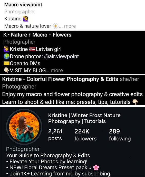 Here’s how I clearly define the niche (macro and flower photography and edits) of my profile:
